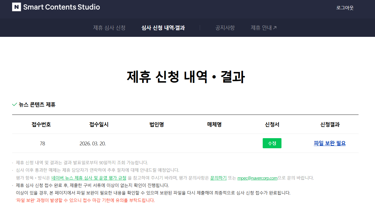 네이버 뉴스제휴심사 및 운영평가 규정을 보고 꼭 양식에 맞춰서 진행하세요!