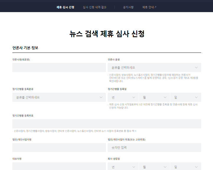 신청서에 언론사 기본 정보는 입력하라는 데로 입력하면 됩니다.